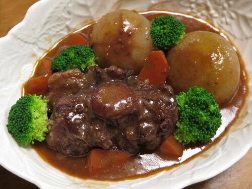 今日の晩御飯は、牛テールの赤ワイン煮を食べました。 中玉ねぎ、丸々ドカンと入れたった。 二人分だけど、これ、食べきることが出来なかった。 ドミグラスソース系がうまく出来た試しがないんだけど、今日のは中々に、中々のお味。 私も成長したのかも? 煮…
