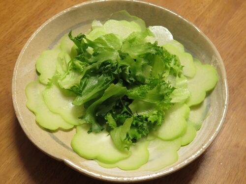 <今日の一皿> ハヤトウリ、という瓜とレタスのサラダ。 説明の通り、くせのない味で食べやすかった。 別の日は短冊にして油揚げと塩炒めにした。それも中々美味しかった。 食べたのは、11月の初め。 また食べたいと思って売り場を良く見ていたけど、巡り会…