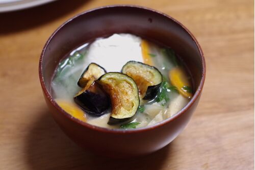 今日の御御御付け 新玉ねぎ 人参 人参の葉 油揚げ ポーチドエッグ 揚げ茄子 落とし卵でなく、ポーチドエッグ。 わざわざそういう面倒なことをする時は、現実逃避したい時と相場が決まっている。 ぐらぐらと沸騰するお湯。 塩と酢を適当に入れる。 鍋肌に箸を…