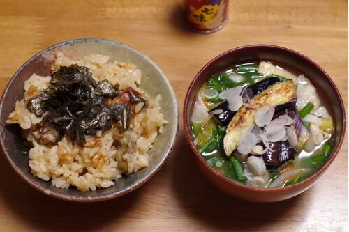 <今日の昼ごはん> 牡蠣飯 具沢山豚汁 豚汁の具は玉ねぎ、人参、キャベツ、豚肉ネギ。 トッピングに焼き茄子、ねぎ、ミョウガ。 シンプルな味噌汁も好きだけど具沢山も大好き・・・好き。 今年は畑に里芋も植えている(普通に食べる様に買ってあったやつか…